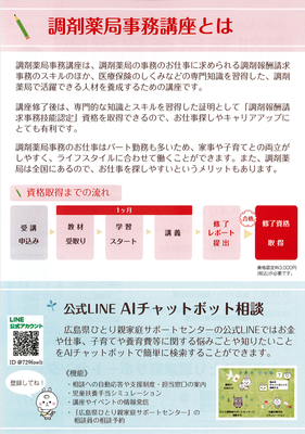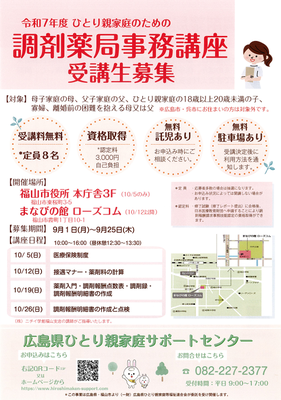 広島市・呉市を除く広島県在住のひとり親家庭の母、ひとり親家庭の父、ひとり親家庭の18歳以上20歳未満の子及び寡婦、離婚前の困難を抱える母又は父(離婚調停中など)を対象に福山市にて『調剤薬局事務事務講座』を開講します。