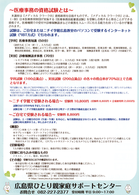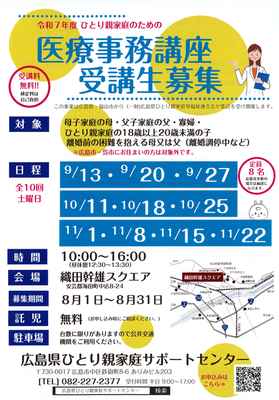 広島市・呉市を除く広島県在住のひとり親家庭の母、ひとり親家庭の父、ひとり親家庭の18歳以上20歳未満の子及び寡婦、離婚前の困難を抱える母又は父(離婚調停中など)を対象に安芸郡海田町にて『医療事務講座』を開講します。
